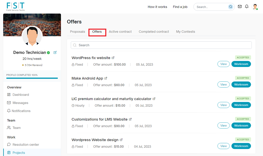 - If you click on the view, a particular offer will open in detail. Upon clicking on the Workroom button, you will be redirected to the virtual workroom of that particular offer.